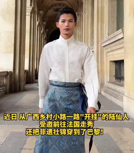 近日,从广西乡村小路一路“开挂”的陆仙人受邀前往法国走秀,还把非遗壮锦穿到了巴黎!用塑料袋、毛毯、胶带等等材料自己做衣服并穿上走秀,非科班出身的陆仙人用数年时间,完成了从籍籍无名到全球瞩目的蜕变,更是受到巴黎旅游局邀请,将中国乡村的烟火气与东方美学带到了世界舞台。陆仙人说,即便他已经来了数次巴黎,但每次来仍然感觉像在做梦:“不止去巴黎,我会一直向前走,一直在路上!”