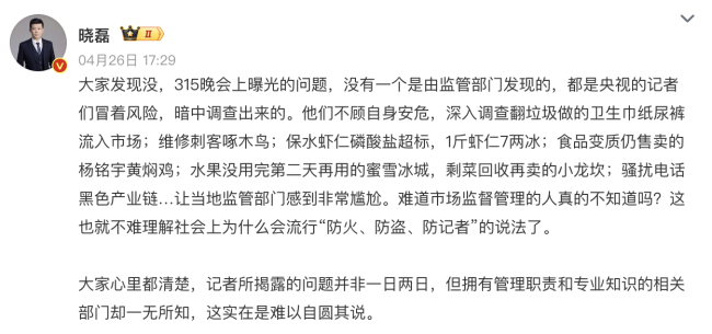 大家发现没,315晚会上曝光的问题,没有一个是由监管部门发现的,都是央视的记者们冒着风险,暗中调查出来的。他们不顾自身安危,深入调查翻垃圾做的卫生巾纸尿裤流入市场;维修刺客啄木鸟;保水虾仁磷酸盐超标,1斤虾仁7两冰;食品变质仍售卖的杨铭宇黄焖鸡;水果没用完第二天再用的蜜雪冰城,剩菜回收再卖的小龙坎;骚扰电话黑色产业链…让当地监管部门感到非常尴尬。难道市场监督管理的人真的不知道吗?这也就不难理解社会上为什么会流行“防火、防盗、防记者”的说法了。