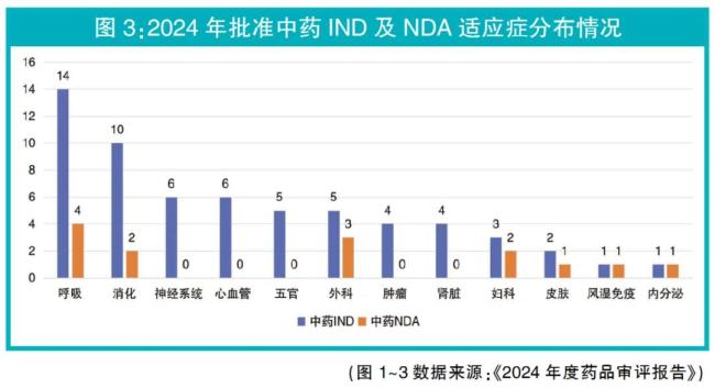 2024年度批准的创新中药IND和NDA适应症都主要集中在消化、呼吸领域,其中呼吸、消化系统用药占新批临床试验的39.34%;呼吸类新药4个,占获批上市药物的28.57%。
