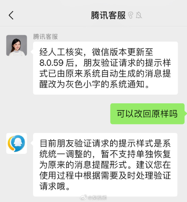 就这一情况咨询腾讯客服后,对方表示经人工核实,微信版本更新至8.0.59后,朋友验证请求的提示样式已由原来系统自动生成的消息提醒改为灰色小字的系统通知。腾讯客服称,该调整属于版本统一优化,暂不支持单独恢复原有样式。建议用户根据实际使用场景及时处理验证请求。