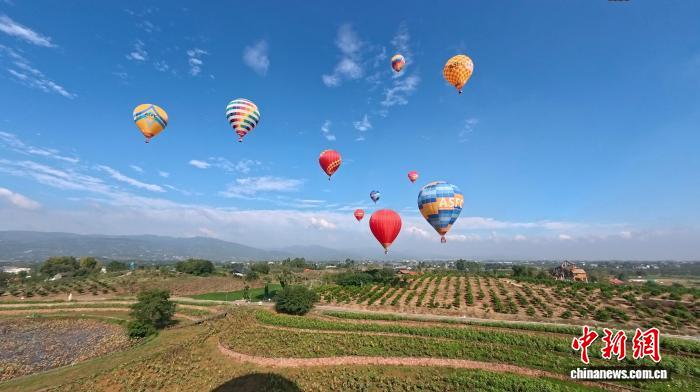中新网成都10月15日电 (王利文 邹立杨)2025年全国热气球精英赛(四川金堂站)暨成都市低空文旅消费季活动15日在成都金堂启幕。在主会场天府橘乡旅游景区,30支参赛队伍依次完成点火、充气,色彩斑斓的热气球依次腾空,与成熟待收的万亩橘林、错落川西民居构成美好画卷,拉开了一场融合体育竞技、低空经济与文旅消费的盛会序幕。