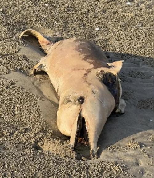 广东湛江一处沙滩现中华白海豚尸体!10月26日,在广东湛江硇洲岛谭北湾的一处沙滩上发现了一只中华白海豚的尸体。这只成年白海豚吻部修长,身体呈现出灰白色并带有斑点。