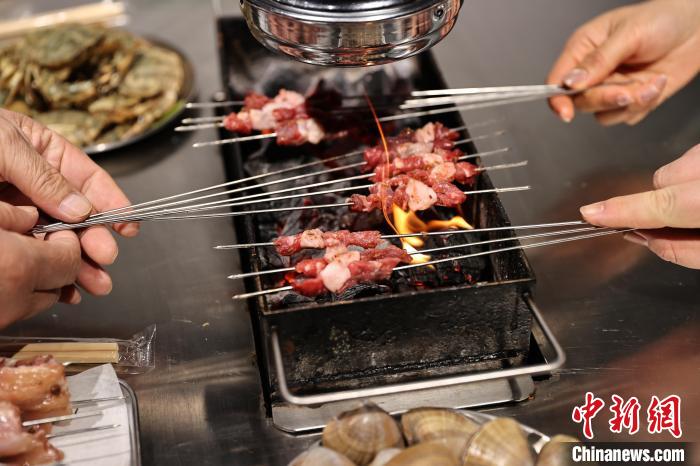 图为食客在烤黄蚬子。中新社记者 于海洋 摄