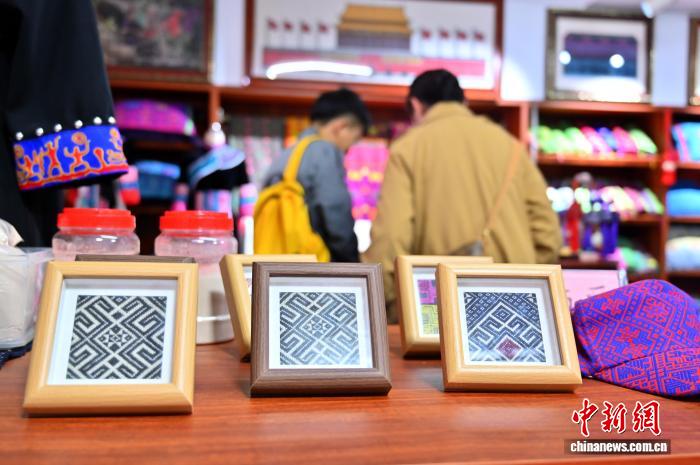 图为李素英创作含有壮、瑶、苗民族元素的织锦作品。俞靖 摄