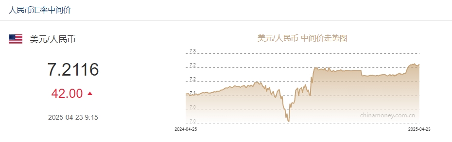 中新网4月23日电 据中国外汇交易中心网站消息,中国人民银行授权中国外汇交易中心公布,2025年4月23日银行间外汇市场人民币汇率中间价为:1美元对人民币7.2116元,下调42个基点。