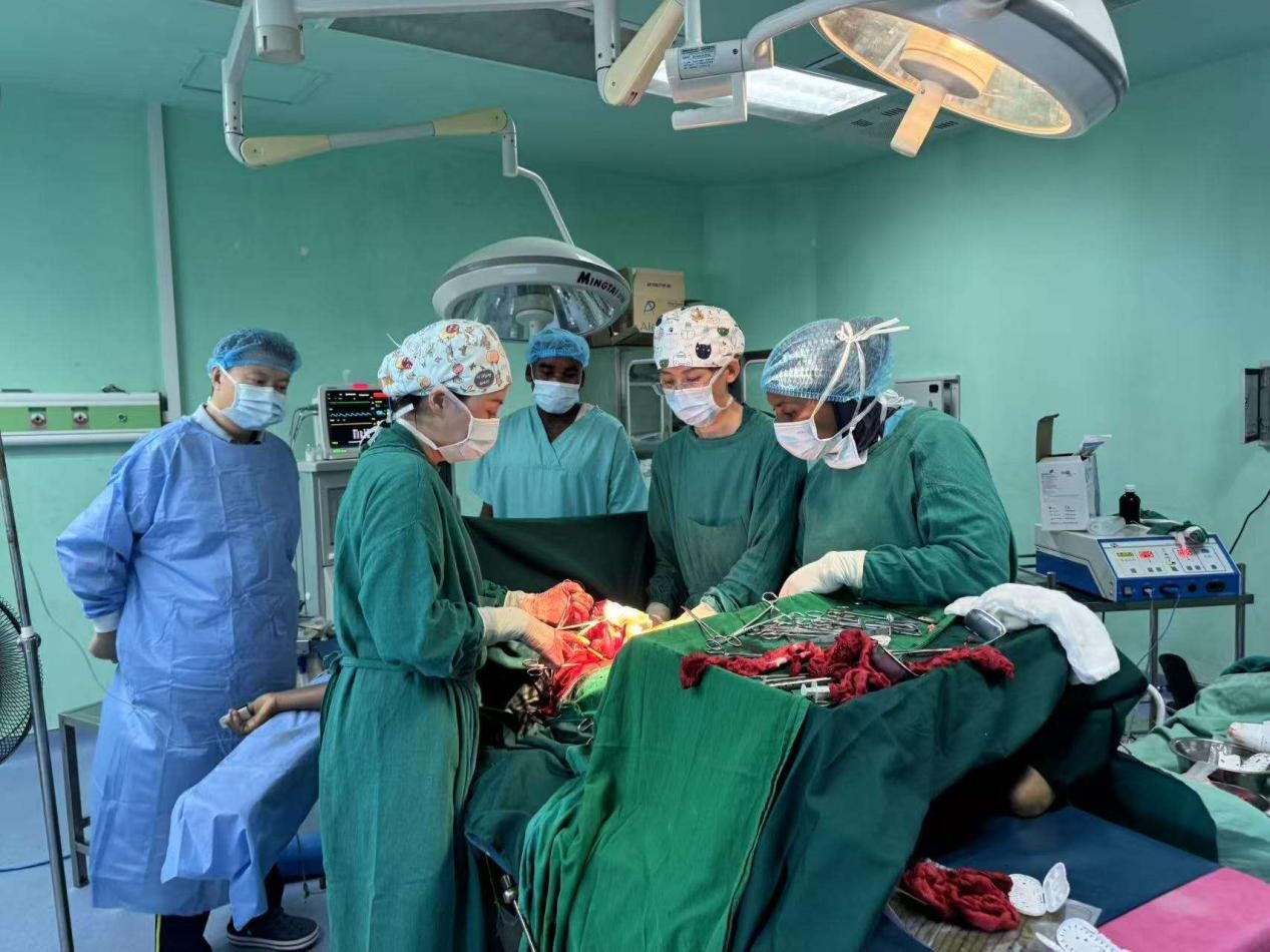 中国医疗队专家与当地医生协同手术。中国援桑医疗队供图