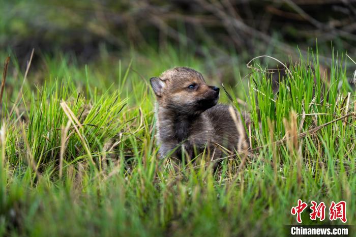 近日,一只小狼崽在内蒙古呼伦贝尔草原上探索世界。田昊霖 摄