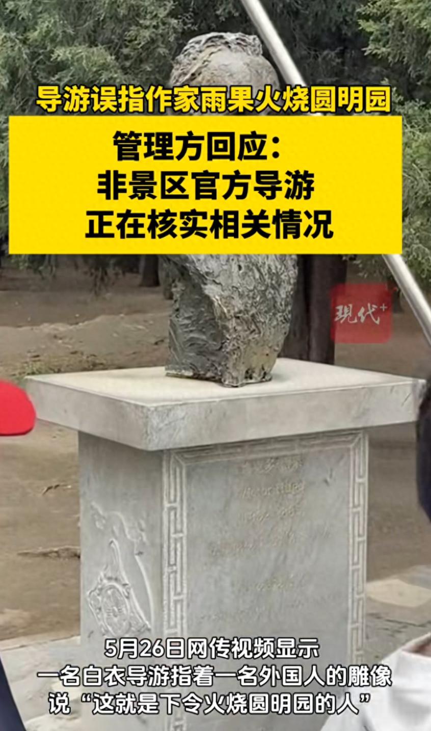 当天,@现代快报 记者致电北京市海淀区圆明园管理处,工作人员称视频中的雕像确系法国作家维克多·雨果,该雕像位于圆明园景区的西洋楼景区内。“因为维克多·雨果获悉英法联军火烧圆明园之后,曾写了一封《给巴特勒上尉的一封信》,在信中谴责了英法联军的所做所为。”该工作人员称,视频中的导游并非景区官方导游,景区官方导游都要求身着蓝色工服上岗的,且不会犯这种低级错误。目前,管理处已经在着手调查此事。