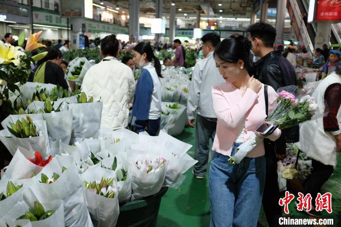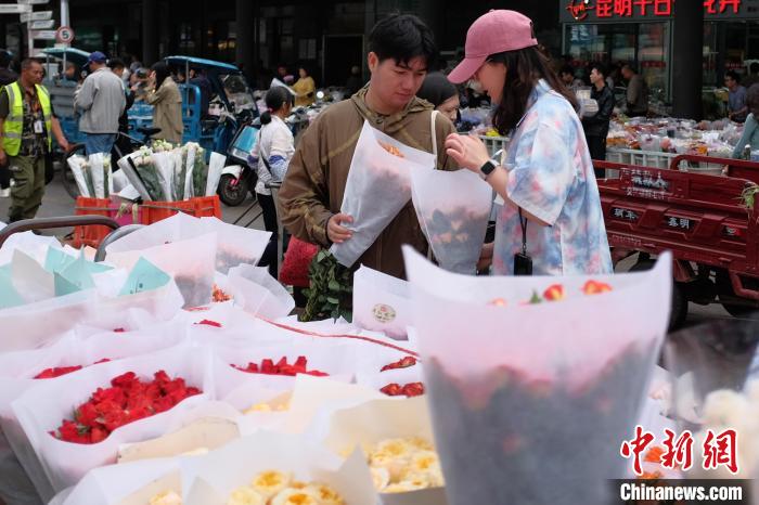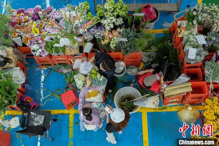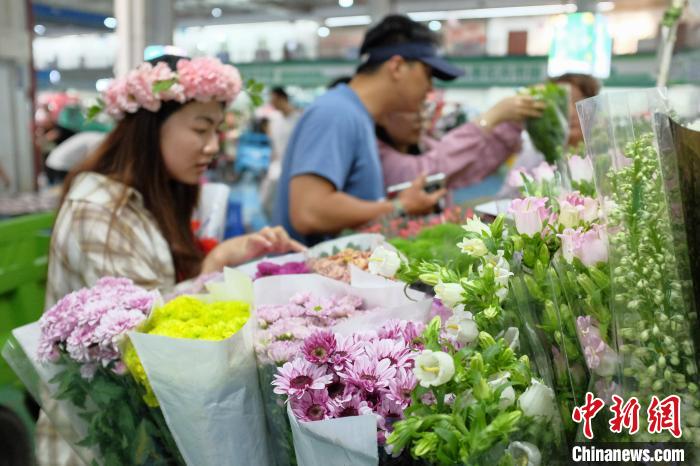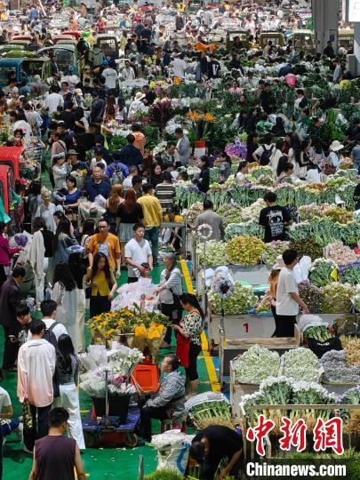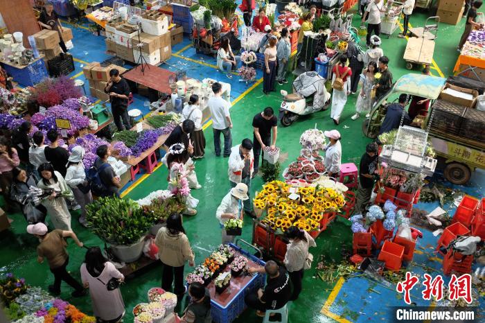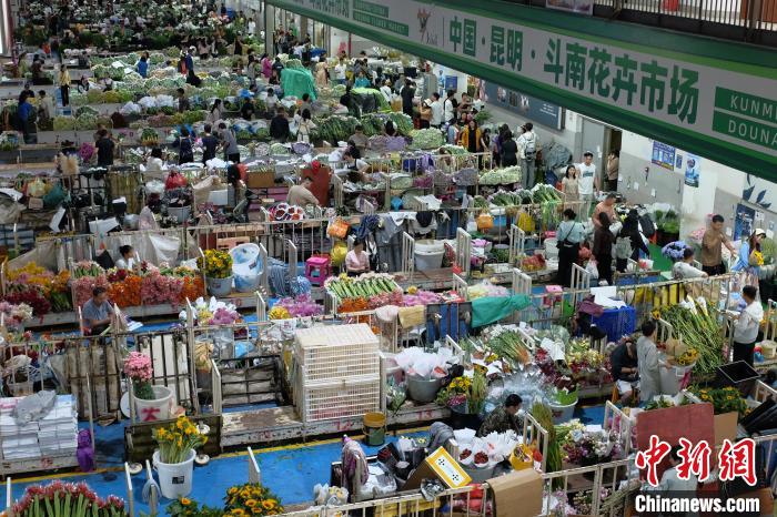 6月2日,端午假期最后一天,昆明斗南花市热闹非凡,众多市民和游客前来挑选心仪的鲜花。中新社记者 刘冉阳 摄