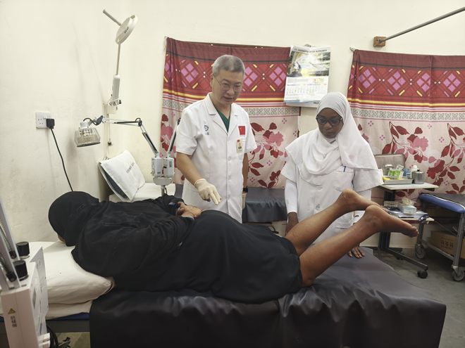 李登科指导患者训练并着重培训当地医护人员。中国援桑医疗队供图