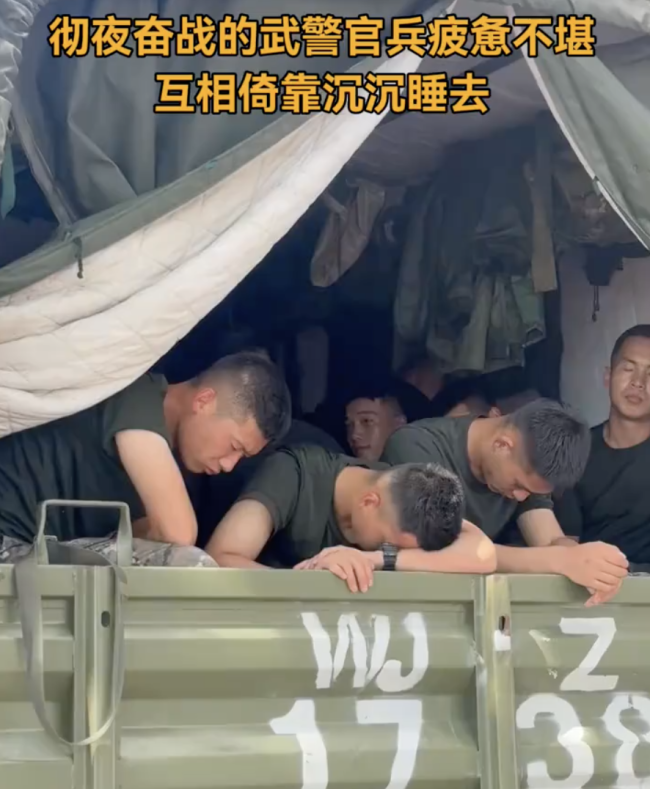 彻夜奋战的武警官兵互相倚靠。7月28日至29日,武警北京总队千余名官兵连夜完成密云区宁村新桥堤坝构筑任务后,因极度疲惫在车上互相倚靠入睡。