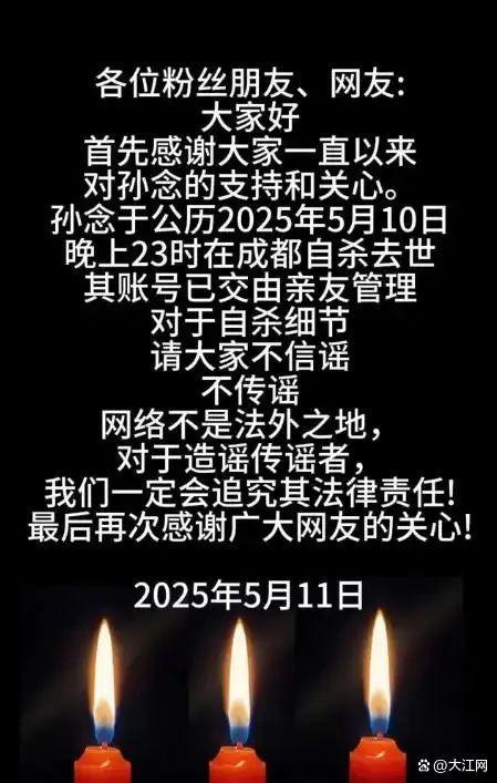 警方将核实网红是小念噢自杀传言 亲友称其被勒索逼死。5月11日凌晨,拥有百万粉丝的网红“@是小念噢”账号更新了一段视频,称博主疑似遭到勒索后自杀。博主真名孙某,视频中提到她已于2025年5月10日23点在成都自杀去世,账号已交由亲友管理,并呼吁大家不信谣、不传谣。