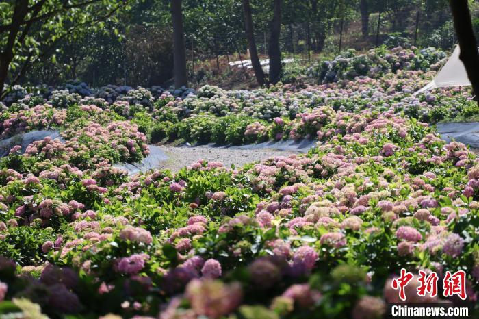 5月12日,贵州惠水,游客在绣球花海中拍照。刘美伶 摄