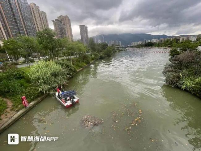 5月24日,福州市民胡女士向海都热线报料称,晋安湖公园湖面出现大量死鱼,部分已开始发臭。工作人员正在打捞。