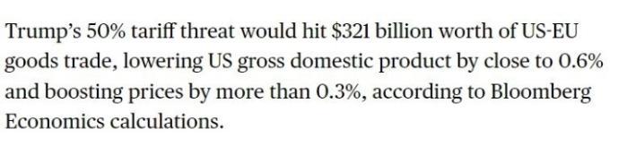 彭博社的计算结果显示,50%的关税将影响价值高达3210亿美元的美欧商品贸易,一旦征收,将使美国国内生产总值(GDP)下降近0.6%,物价上涨超过0.3%。