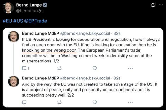 “如果美国寻求合作与谈判,欧盟总是愿意敞开大门;但如果只是想让我们照单全收美方的要求,那它就是敲错了门。”