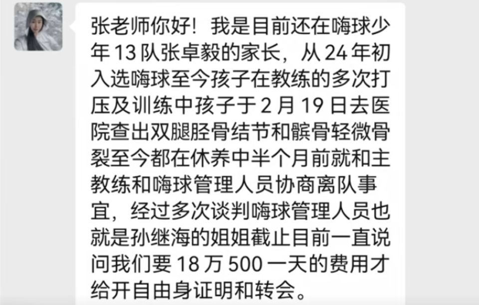 这位青训小球员的妈妈表示,他孩子去年加入孙继海“嗨球”青训,因过度训练后查出膝盖严重受伤需要休养。她出于对孩子健康考虑,选择退出“嗨球”青训。但“嗨球”青训坚持要求他们家按每天500的标准赔偿18万,才能给孩子自由身证明。家长认为这笔费用他们无法承担,而且也违背了孙继海所承诺的免费青训。