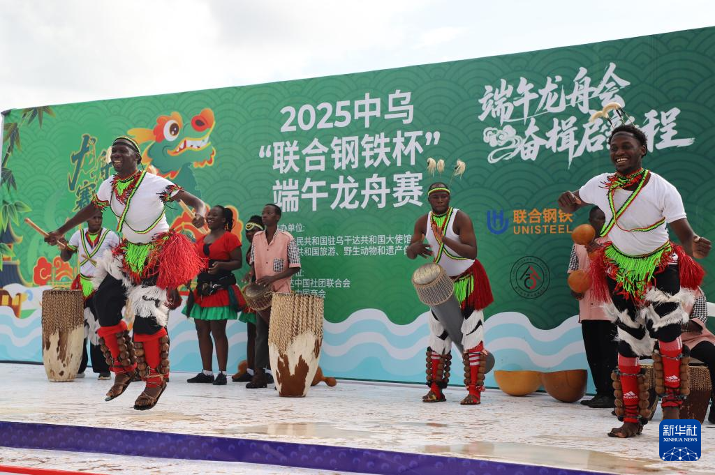 6月1日,当地民众在乌干达中部瓦基索区举行的端午龙舟赛活动现场表演舞蹈。新华社发(尼古拉斯·卡乔巴摄)