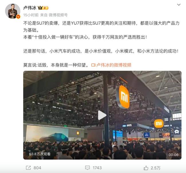 外界普遍认为,余承东所指的这家企业是小米。当天晚上,小米集团总裁卢伟冰回应称,无论是SU7的热销还是YU7受到的高度关注,都是基于其强大的产品力。他表示,小米汽车的成功源于小米的价值观、模式和方法论,并再次引用了莫言的那句名言。随后,小米汽车副总裁李肖爽也转发了这条消息,并重复了这句话。