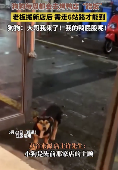 烤鸭店搬家小狗跑6站地找来!5月22日(报道时间),江苏常州,狗狗每周都会去烤鸭店“蹭饭”,老板搬新店后,需走6站路才能到。店主许先生称,小狗是先前那家店的主顾,经常去吃鸭屁股,去年开了新店后,小狗一周大概还会来3次,“它到这边来估计要走6站路,我也好奇……”
