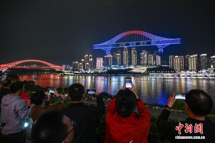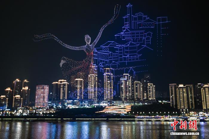 11月4日晚,“新韵重庆”无人机灯光秀第十四届中国艺术节闭幕式专场表演在重庆两江交汇的夜空璀璨上演。中新社记者 何蓬磊 摄