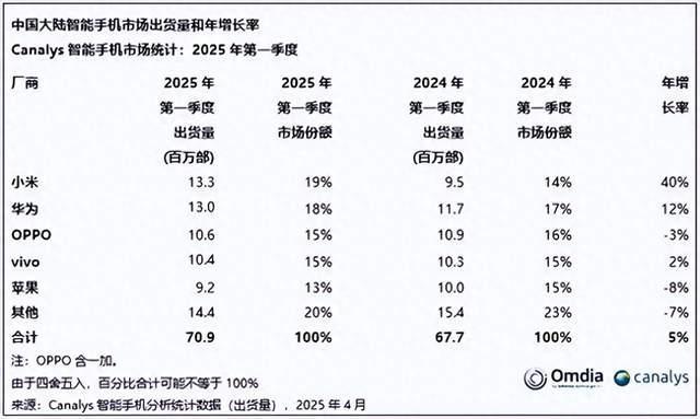 三星份额下滑至28%,但仍居榜首,苹果和OPPO均以17%的份额并列第三。全球智能手机市场竞争依旧激烈,Canalys数据显示,全球手机一季度出货量同比增长了1%。小米在全球市场位列前三,但在不同市场表现分化明显,例如在印度市场出现明显下滑,在欧洲表现也不太乐观,但在非洲市场和东南亚市场实现了增长。