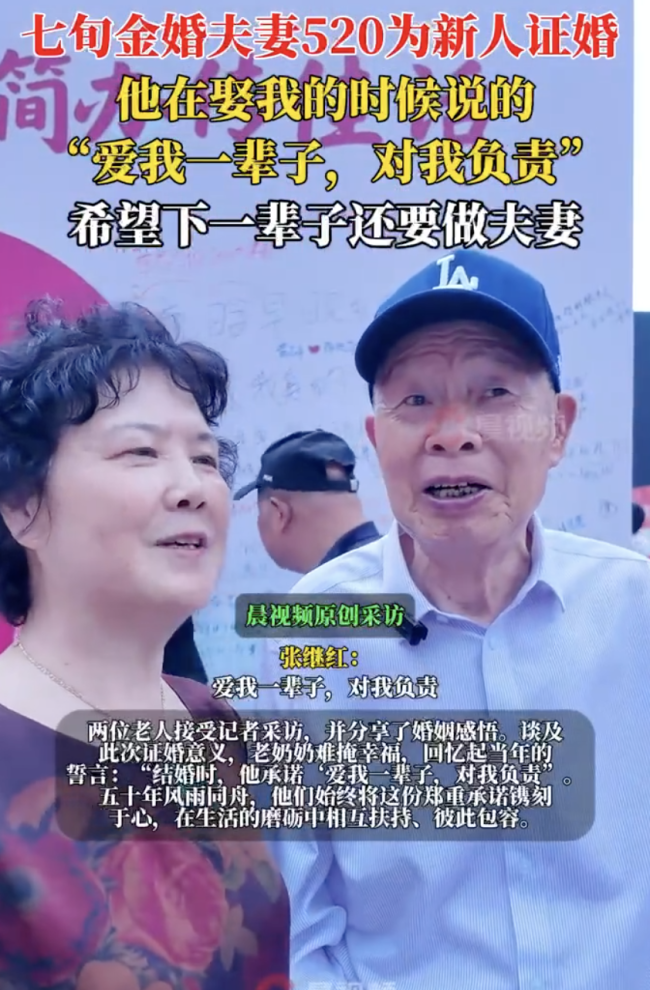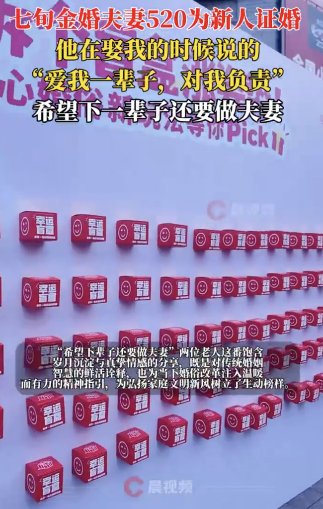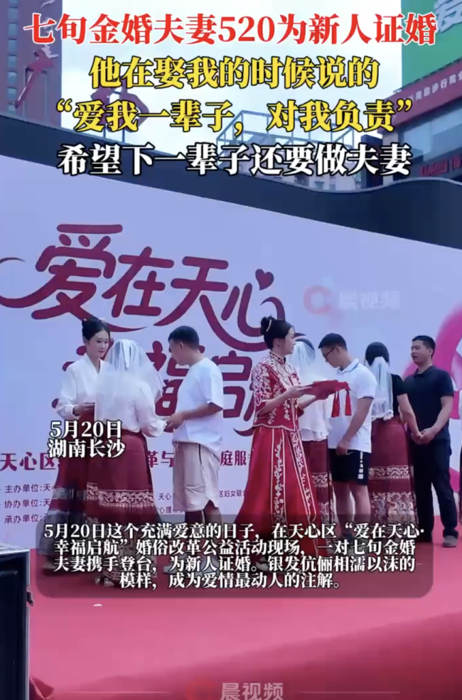 七旬金婚夫妻为新人证婚。5月20日,七旬金婚夫妻在天心区‘爱在天心’为新人证婚,承诺“爱我一辈子”并续写婚姻故事。
