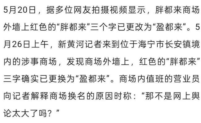 近期,因取名引发争议的“胖都来”已改名为“盈都来”,再度引发网友热议。商场董事长都建明解释称,公司以前的名称就叫“盈都公司”。对于之前因取名“胖都来”引发的舆论风波,都建明表示并不后悔。