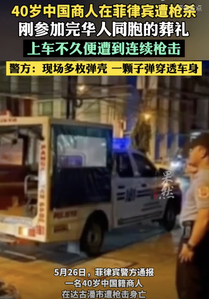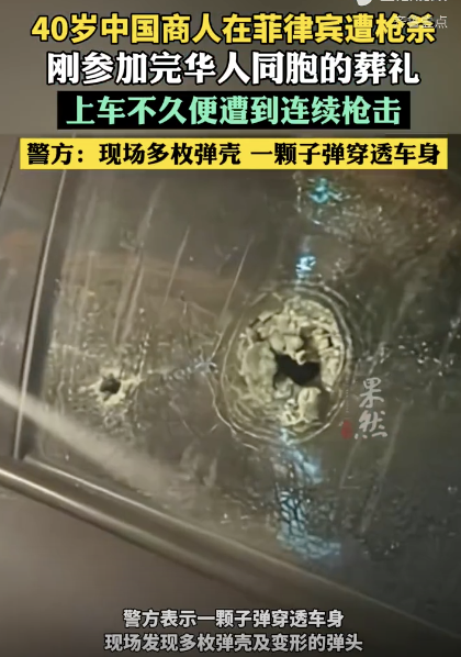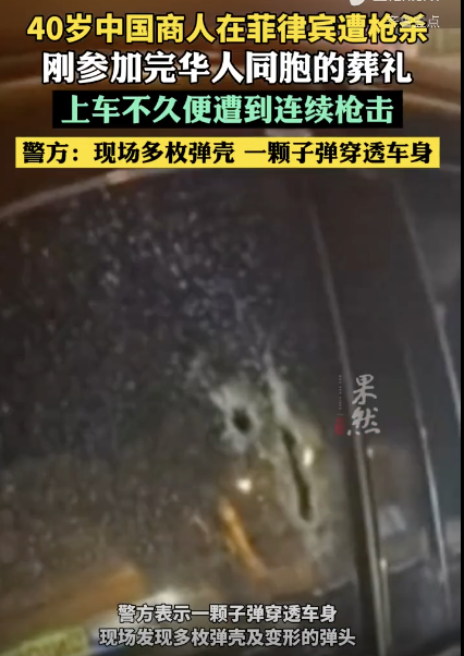一中国商人在菲律宾遭枪杀,刚参加完同胞葬礼!中国商人在菲律宾遭枪杀,刚参加完同胞葬礼!警方:子弹穿透车身!现场画面曝光5月26日,菲律宾警方通报,一名40岁中国籍商人在达古潘市遭枪击身亡。案发于24日深夜,该名商人刚参加完一位华人同胞的葬礼,他上车不久便遭到一身份不明男子的连续枪击,在被送往医院途中不治身亡。警方表示一颗子弹穿透车身,现场发现多枚弹壳及变形的弹头。警方正在调查这起枪击案的动机并启动封锁和设卡检查以追捕凶手。