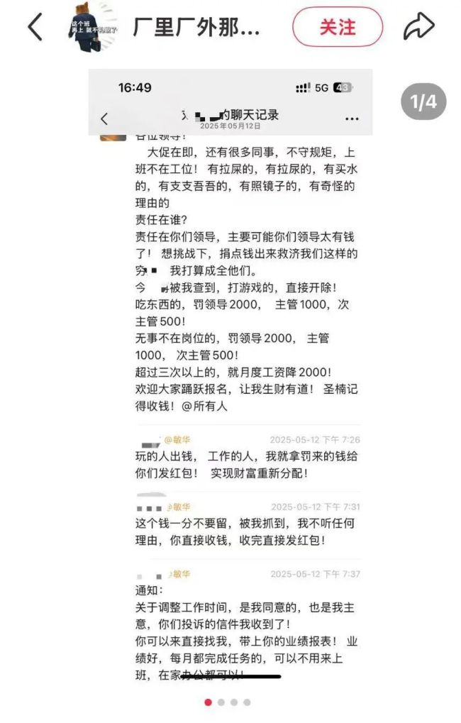 高管称一晚罚款进账大几千 企业回应 罚款言论引热议!因芝华仕沙发闻名的上市家居企业敏华控股,近日因一高管随意罚款言论引发热议。有网友发帖称,敏华家居电商部的一位刘姓高管要求员工不得在工位就餐,强制加班并要求一天打卡六次,不愿意的自行离职,质疑这些行为违反劳动法。聊天截图显示,该高管在工作群中表示,发现员工上班不在工位、上厕所、照镜子等情况,将对打游戏的行为直接开除,吃东西的行为进行罚款,并规定下班不关电脑罚100元。此外,该高管还提到,通过罚款筹集的资金将用于团队建设,如购买书籍和建图书馆。这些言论在网络上引起了广泛讨论。