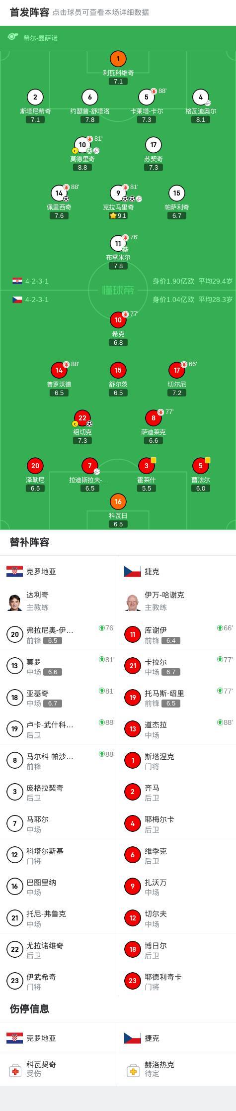 北京时间6月10日,世界杯欧洲区预选赛第一阶段小组赛第4轮,克罗地亚对阵捷克。上半场克拉马里奇头球破门,下半场绍切克扳平比分,随后莫德里奇点射命中,佩里西奇低射建功,布季米尔点球得分,克拉马里奇再入一球。最终,克罗地亚以5-1战胜捷克。