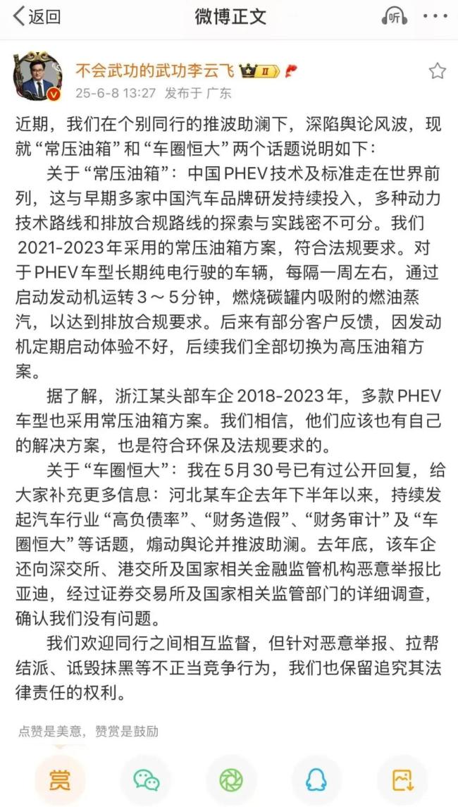 6月8日午间,比亚迪公关总经理李云飞在微博针对常压邮箱和车圈恒大质疑在微博发布长文进行了回应。李云飞在微博中否认比亚迪的“常压油箱”存在排放造假。其表示,中国PHEV技术及标准走在世界前列,这与早期多家中国汽车品牌研发持续投入,多种动力技术路线和排放合规路线的探索与实践密不可分。而比亚迪在2021-2023年采用的常压油箱方案,符合法规要求。