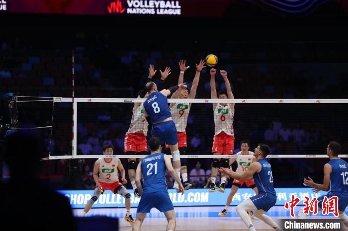 6月12日,2025世界男排联赛(中国西安站)激战正酣。图为中国队(白色上衣)与塞尔维亚队交锋。中新社记者 张一辰 摄