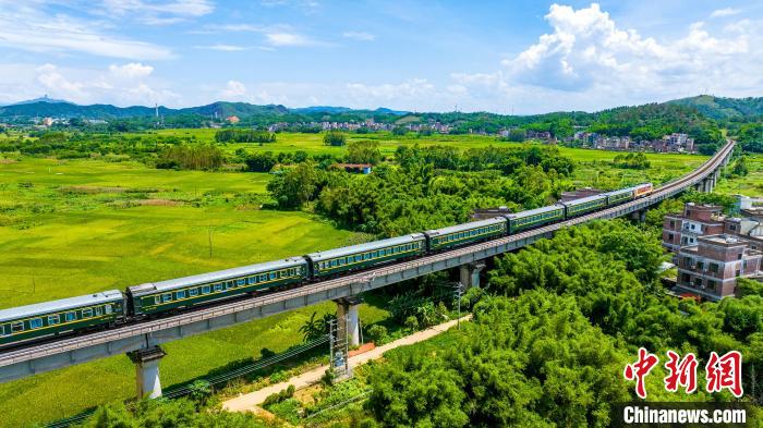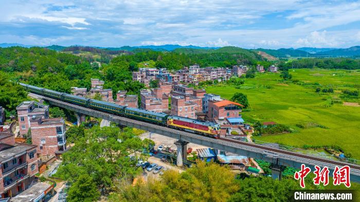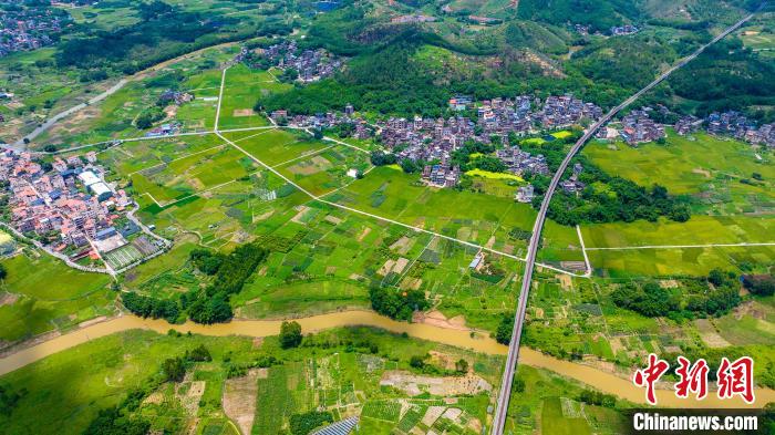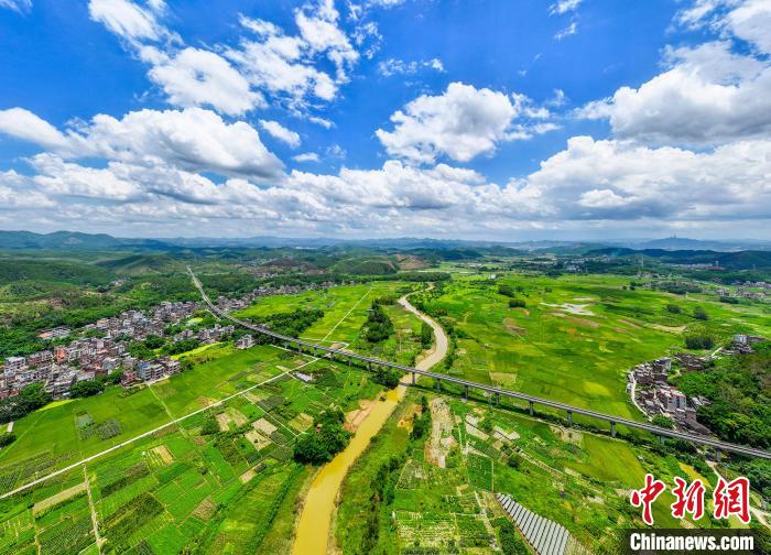 近日,广西梧州市万秀区夏郢镇凤凰村一带,绿意盎然的田园与错落的民居、蜿蜒的村道、清澈的河流以及穿行其间的铁路相映成趣,勾勒出一幅和美乡村新画卷。何华文 摄