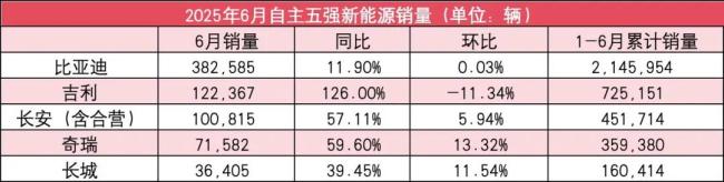 从上半年整体销量来看,比亚迪累计销量已经超200万辆;吉利、奇瑞和长安自主累计销量均已过百万,大概在110万-140万的区间;长城最低,不足57万辆。