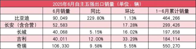 而海外市场的竞争,5家都保持了正增长。其中,奇瑞6月销量为106,330辆,同比增长9.58%,环比增长5.55%,今年1-6月,奇瑞累计出口量为550,270辆,同比增长3.3%,蝉联中国车企出口第一。不过在比亚迪的猛烈追击下,奇瑞出口第一的位置正在受到挑战。6月份,比亚迪出口量为90,049辆,同比增长229.8%,环比增长1.13%;1-6月,比亚迪累计出口量为464,266辆。