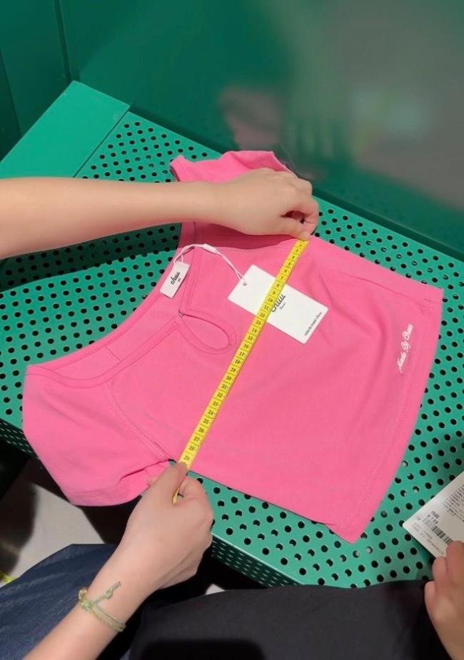 在一家网红女装店内,店员表示衣服吊牌上的“F码”意思就是“均码”。测评员分别试穿并现场测量了三件上衣,胸围(二分之一)、肩宽和腰宽分别为33cm,40cm,31cm;30cm,30cm,29cm;30cm,30cm,29cm。另一家女装店内的三件尺码为“one size”的上衣,胸围(二分之一)、肩宽和腰宽分别为32cm,38cm,33cm;40cm,38cm,36cm。对比市面上某知名连锁品牌的童装尺寸,160/76的儿童T恤,肩宽为43cm,身宽(二分之一胸围)为49cm,连肩袖长为37.5cm。也就是说,这些女装店铺的短袖T恤比前述童装的胸围和肩宽都要小。