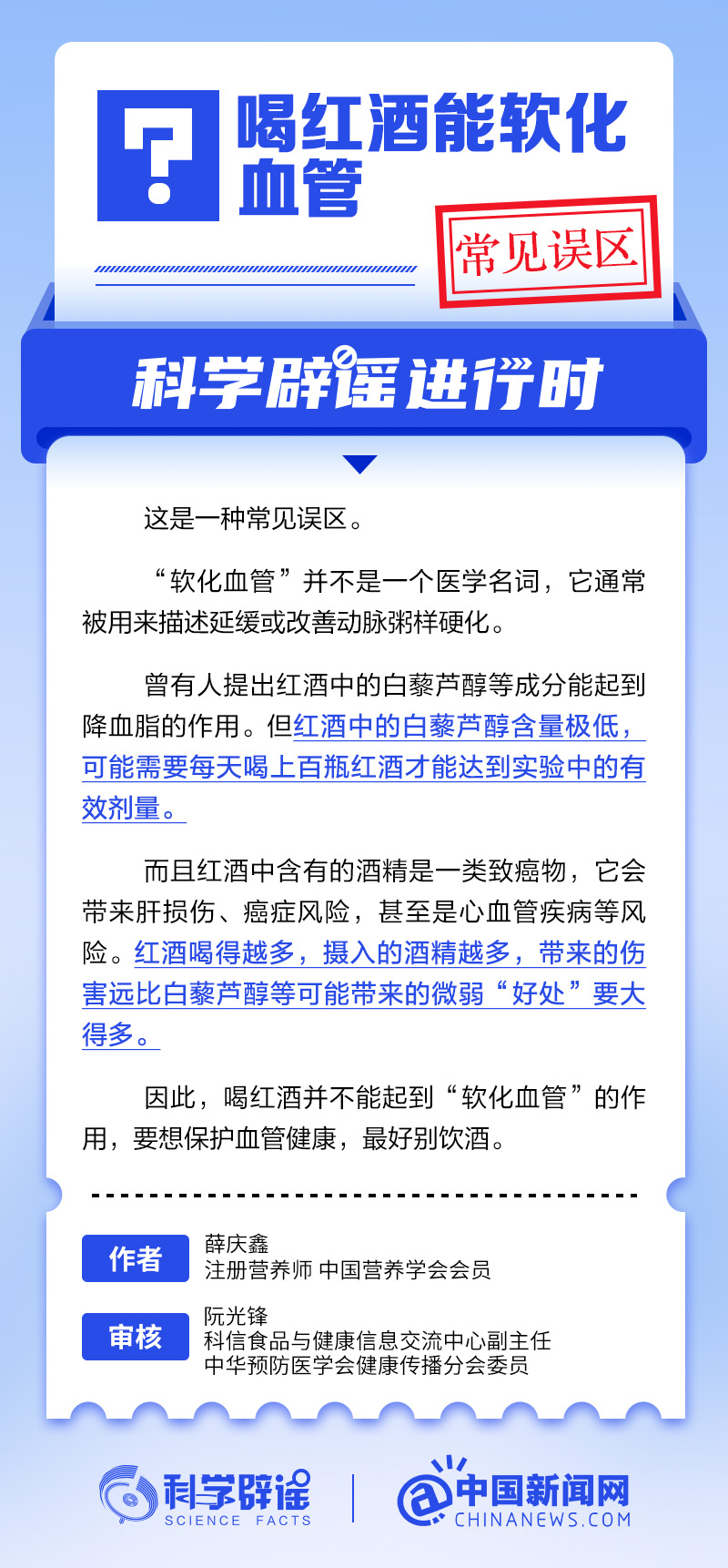 中新网7月30日电 “软化血管”通常被用来描述延缓或改善动脉粥样硬化。曾有人提出红酒中的白藜芦醇等成分能起到降血脂的作用。但红酒中的白藜芦醇含量极低,可能需要每天喝上百瓶红酒才能达到实验中的有效剂量。且酒精是一类致癌物,它会带来肝损伤、癌症风险,甚至是心血管疾病等风险。摄入的酒精越多,带来的伤害远比白藜芦醇等可能带来的微弱“好处”要大得多。(来源:@科学辟谣 中国新闻网微博)