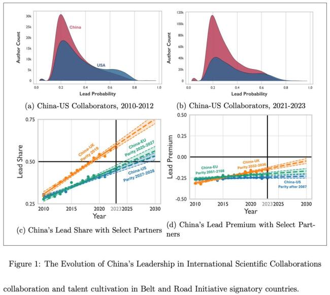 在全球科研合作团队中,中国科学家正快速缩小与美欧在领导力上的差距。数据显示,2010年中美合作论文中担任团队领导的中国科研人员仅占约30%,而到2023年这一比例已升至45%。预计在2027年前后,中国与美国科研合作中的领导者占比将达到平衡。尽管如此,在人均领导力方面,中国仍需长时间追赶。