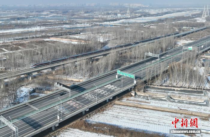 2023年12月28日,京雄高速公路(北京段)五环至六环段开通。图为当日“复兴号”高铁列车从京雄高速旁驶过。(无人机照片) 中新社记者 贾天勇 摄