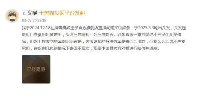 然而,一位消费者投诉称,2024年12月18日在抖音麻辣王子官方旗舰店直播间购买该辣条,2025年3月3日吃出头发,头发压进封口条食用时被带出,头发压痕与封口处压痕吻合。