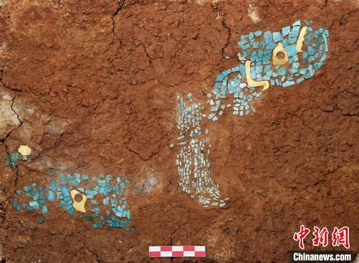 湖北黄陂盘龙城遗址出土的金片绿松石镶嵌兽面形器。(主办方供图)