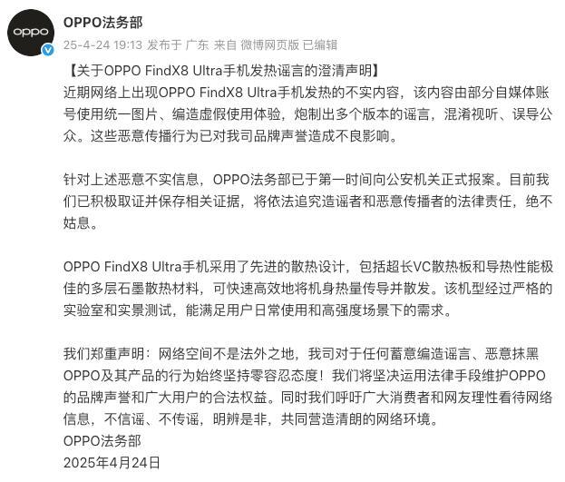 4月24日晚间,OPPO法务部发布声明,指出近期网络上有关OPPO Find X8 Ultra手机发热的信息不实。针对这些恶意不实信息,OPPO法务部已向公安机关正式报案,并积极取证保存相关证据。公司将依法追究造谣者和恶意传播者的法律责任,绝不姑息。