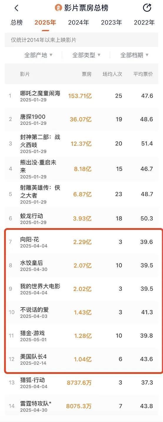 值得注意的是,密钥已经延期至5月31日的春节档冠军《哪吒之魔童闹海》,上映近百天依旧“能打”,五一假期期间累计收获票房超6000万。