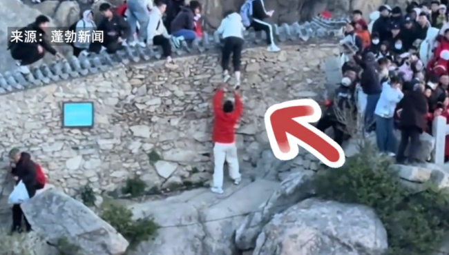 女子爬泰山翻墙抄近道,男同伴没接稳,两人摔进山缝里!出门在外,安全第一!