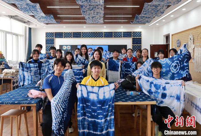 扎染课上,香港学子跟随指导老师将各种颜料结合在一起,制作扎染作品。“我觉得这是一次很好的体验,让我认识到了传统的扎染艺术。”香港王肇枝中学学生周本轩说。