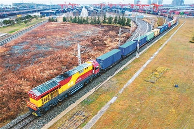 2025年开年至今,西安国际港站多次刷新该站中欧班列日装车纪录。图为近日一列满载日用百货、汽车配件、化妆品等货物的中欧班列从西安国际港站缓缓驶出,开往德国杜伊斯堡。
