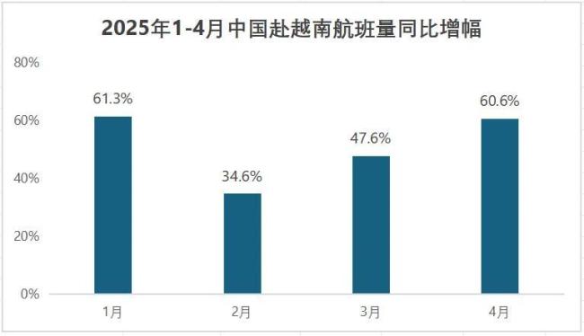 今年前四个月,中国飞往越南的航班数量分别达到1779班、1573班、1684班和1752班,相较2024年同期增幅分别达到61.3%、34.6%、47.6%和60.6%。