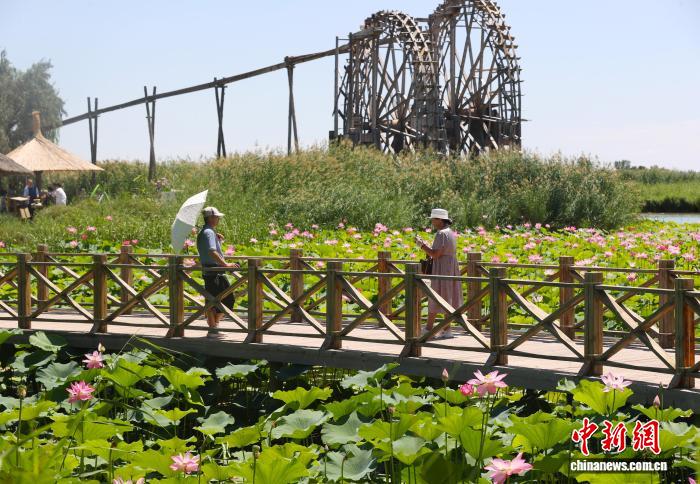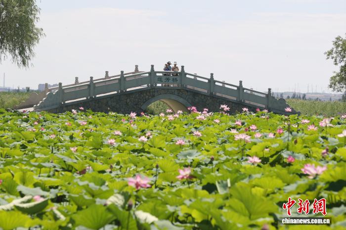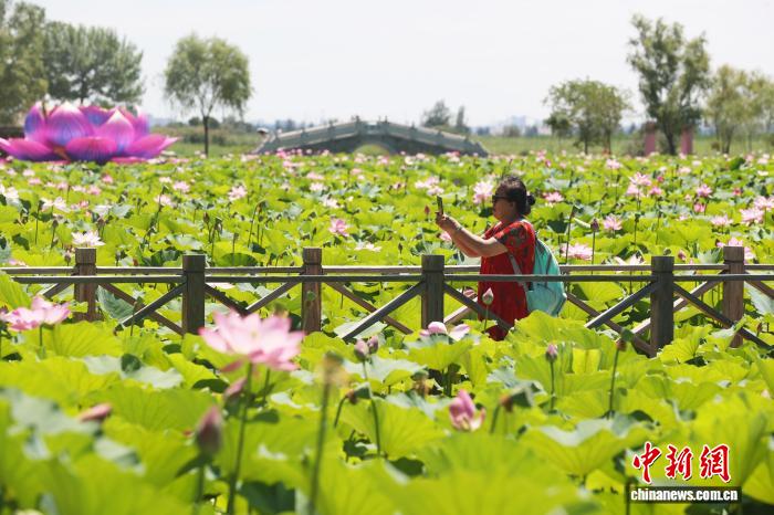 7月20日,宁夏银川,市民在鸣翠湖国家湿地公园内赏荷拍照。盛夏时节,宁夏银川市鸣翠湖国家湿地公园的荷花竞相开放,为湿地增添美丽景观,吸引游客前来打卡拍照。中新社记者 于晶 摄