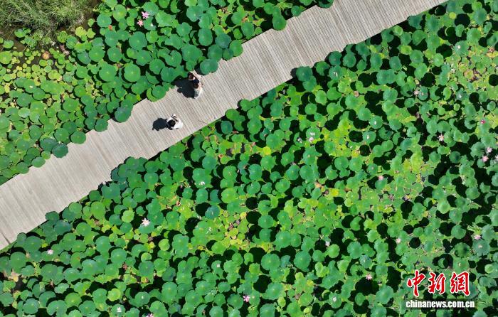 7月20日,宁夏银川,市民在鸣翠湖国家湿地公园内赏荷拍照。盛夏时节,宁夏银川市鸣翠湖国家湿地公园的荷花竞相开放,为湿地增添美丽景观,吸引游客前来打卡拍照。(无人机照片)中新社记者 于晶 摄
